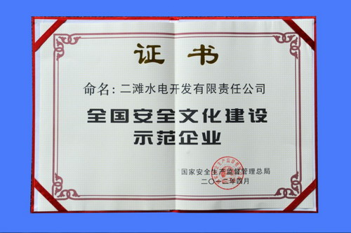 2012年5月9日-10日,國家安全生產監(jiān)督管理總局在甘肅省金昌市組織召開了2012年全國安全生產宣傳工作會議暨安全文化建設現(xiàn)場會。會上,二灘公司被國家安全生產監(jiān)督管理總局授予“全國安全文化建設示范企業(yè)”榮譽稱號。
