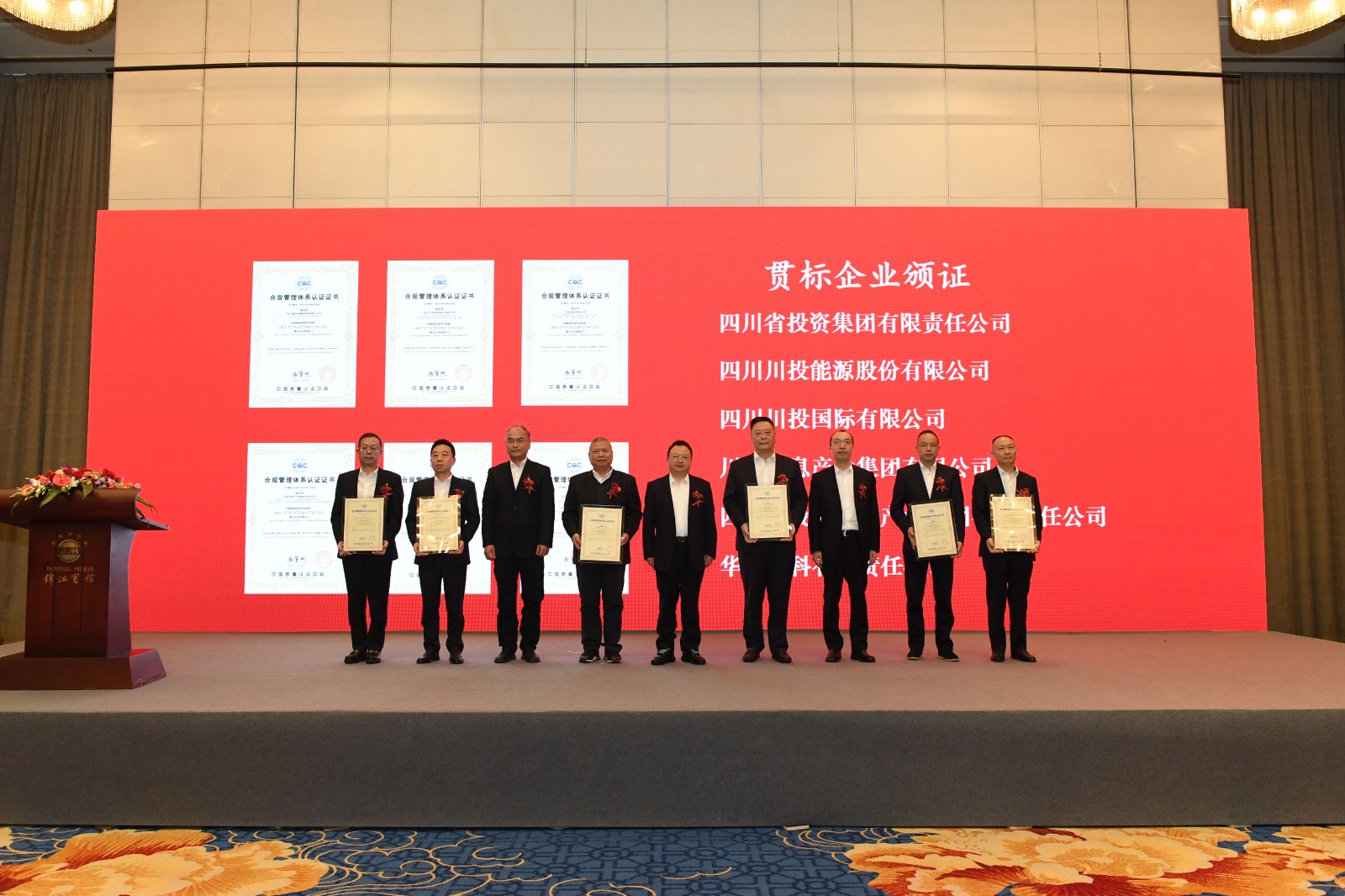 川投集團公司黨委副書記、副董事長、總經(jīng)理李文志及5戶所屬公司的主要負(fù)責(zé)人作為代表上臺,接受了省國資委及中國質(zhì)量認(rèn)證中心頒發(fā)的證書。