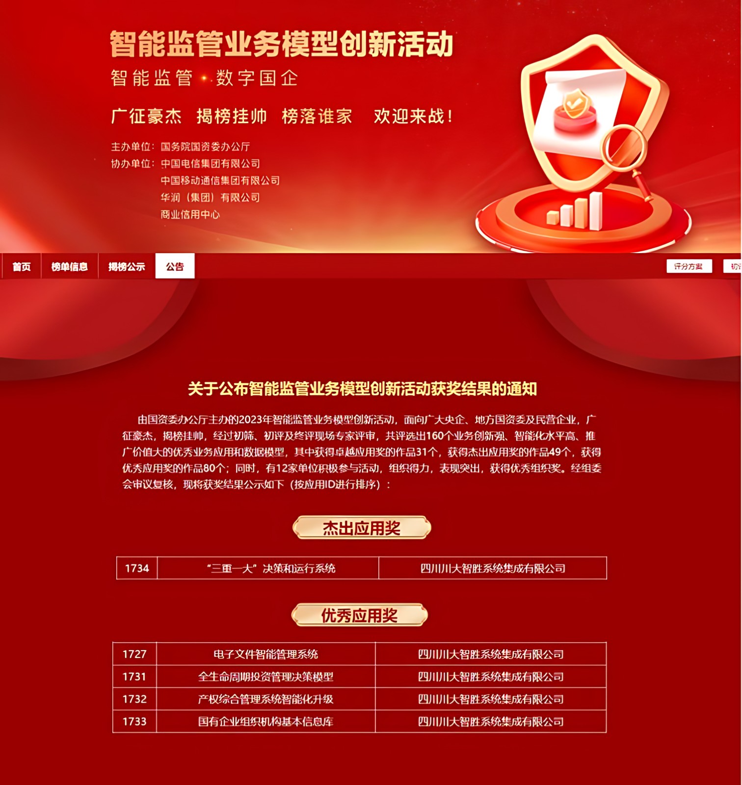 12月28日,由國(guó)務(wù)院國(guó)資委辦公廳主辦的2023年智能監(jiān)管業(yè)務(wù)模型創(chuàng)新活動(dòng)最終獲獎(jiǎng)名單出爐,公司所屬智勝集成五項(xiàng)應(yīng)用榮獲一項(xiàng)“杰出應(yīng)用獎(jiǎng)”、四項(xiàng)“優(yōu)秀應(yīng)用獎(jiǎng)”。