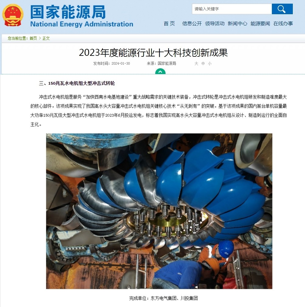 近日,國家能源局發(fā)布了2023年度能源行業(yè)十大科技創(chuàng)新成果,田灣河公司與東方電氣集團東方電機有限公司聯合研制的150兆瓦水電機組大型沖擊式轉輪成果位列其中。該項成果實現了我國高水頭大容量沖擊式水電機組關鍵核心技術“從無到有”的突破,標志著我國實現高水頭大容量沖擊式水電機組從設計、制造到運行的全面自主化。