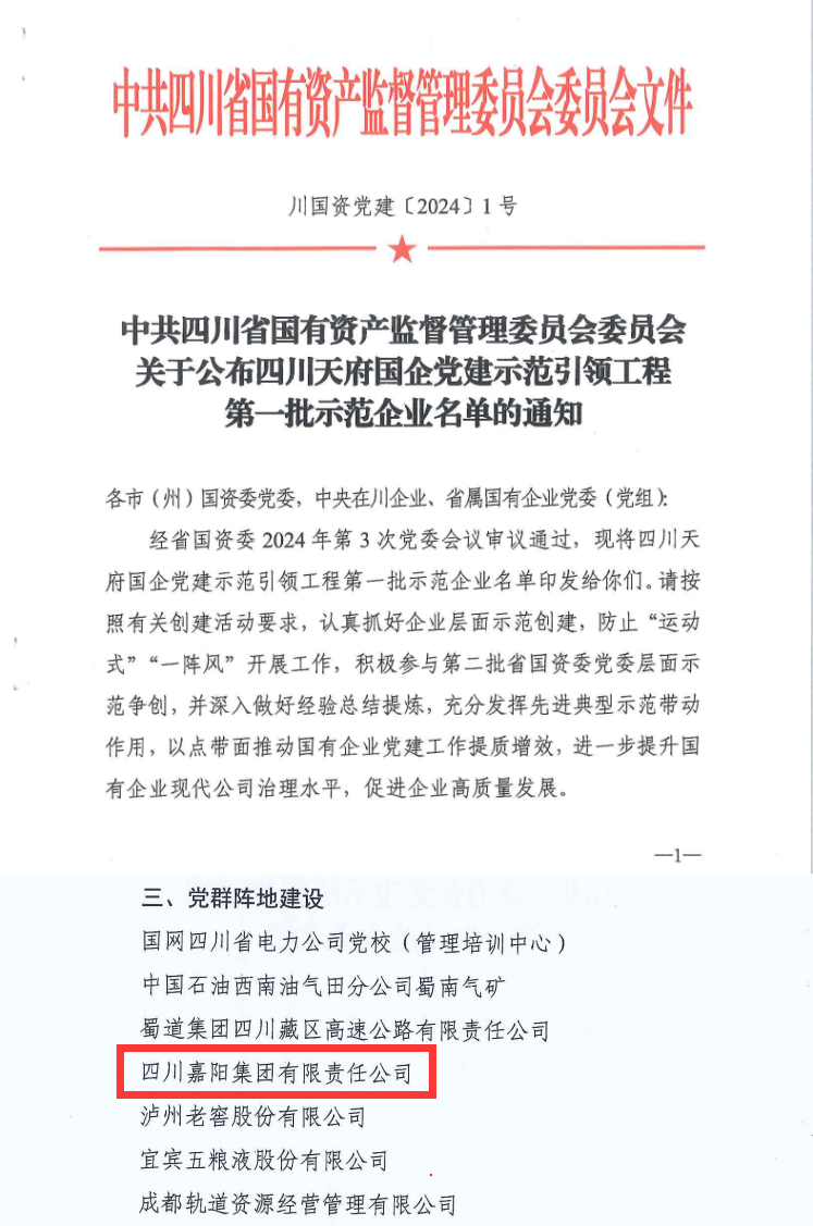 近日,四川省國資委黨委印發(fā)《關(guān)于公布四川天府國企黨建示范引領(lǐng)工程第一批示范企業(yè)名單的通知》,川投集團所屬四川嘉陽集團有限責(zé)任公司(以下簡稱“嘉陽集團”)從全省數(shù)百家申報企業(yè)中脫穎而出,成功入選四川天府國企黨建示范引領(lǐng)工程“黨群陣地建設(shè)”第一批示范企業(yè)。