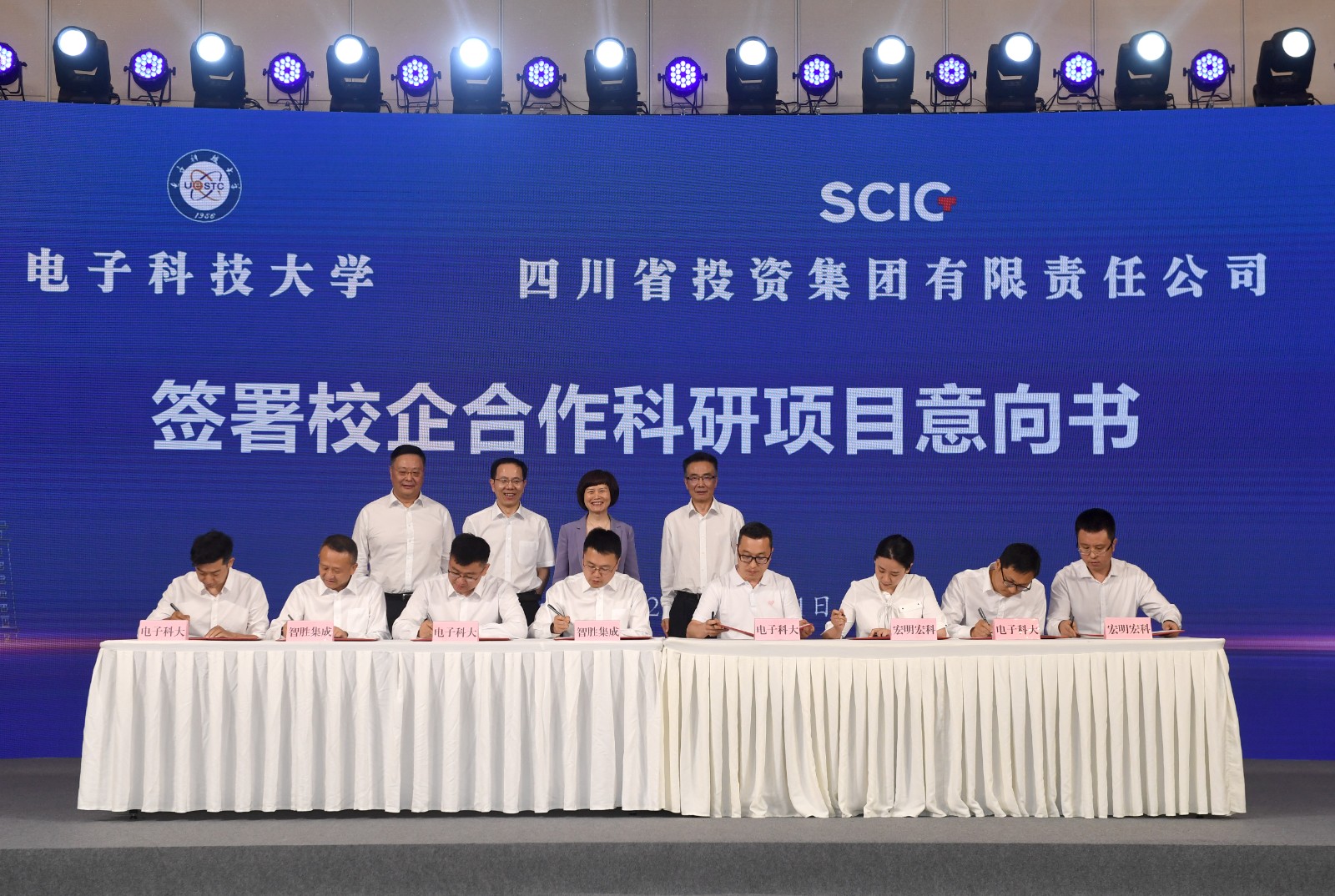 簽約儀式上,川投信產(chǎn)智勝集成、宏明宏科與電子科技大學(xué)相關(guān)項(xiàng)目組共同簽署4個(gè)校企合作科研項(xiàng)目意向書。