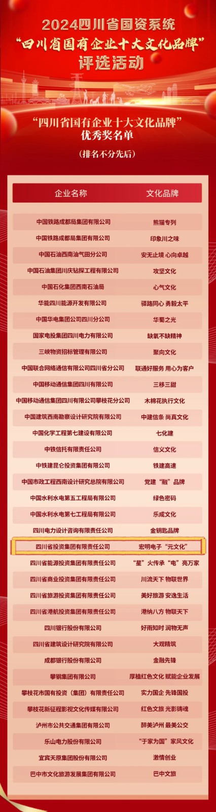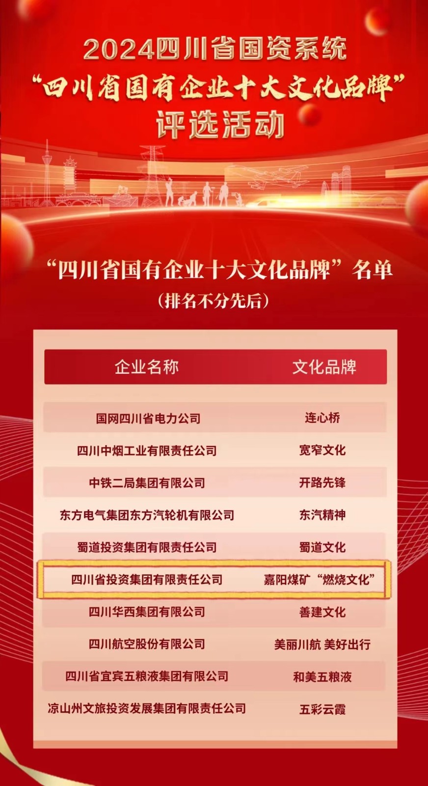 5月28日,省國資委正式發(fā)布“四川省國有企業(yè)十大文化品牌”名單和10個(gè)提名獎(jiǎng)、35個(gè)優(yōu)秀獎(jiǎng)品牌名單,川投集團(tuán)榜上有名。其中,川投集團(tuán)嘉陽煤礦“燃燒文化”獲評“四川省國有企業(yè)十大文化品牌”,宏明電子“元文化”獲評“四川省國有企業(yè)十大文化品牌”優(yōu)秀獎(jiǎng)。