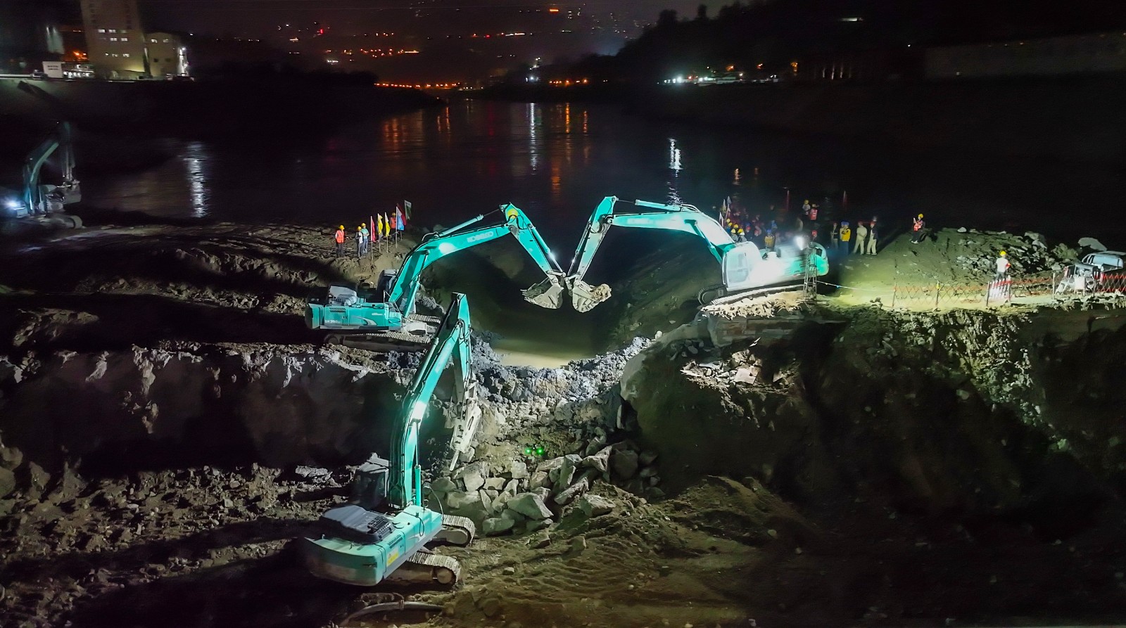 10月25日晚,隨著指令響起,十余臺挖掘機在二期上游圍堰右岸進行破口開挖,奔騰的金沙江水隨即涌入主河床廠房與溢流壩上游,充水平壓后江水經溢流壩段流向下游,銀江水電站成功實現分流。這一重要進展為按期完成導流明渠截流打下堅實基礎,也標志著銀江水電站首臺機組投產發(fā)電正式進入倒計時階段。