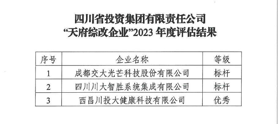 近日,省國資委對全省100戶“天府綜改企業(yè)”2023年度重點改革任務(wù)開展情況進行了專項評估,川投集團所屬交大光芒、川投數(shù)科獲評“標桿”,川投西昌大健康獲評“優(yōu)秀”,受到省國資委通報表揚。