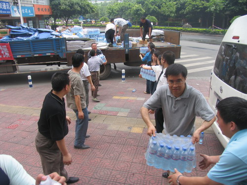 2008年5月15日14點(diǎn)至16日12點(diǎn),中建八局、中建三局、四川瑞云、重慶園林、浙江精工、上海和興、北京綠菌、深圳黎源等眾多施工單位均踴躍向?yàn)?zāi)區(qū)獻(xiàn)愛心,捐贈(zèng)抗震救災(zāi)物資,共計(jì)收到災(zāi)區(qū)急需物資有礦泉水528件、帳篷43頂、雨靴30雙、火腿腸4箱、榨菜10箱、餅干73箱、面包2箱、方便面125件、彩條布97件、軍用被10床、雨衣140件、手套8箱(4800雙)、尼龍繩10公斤。