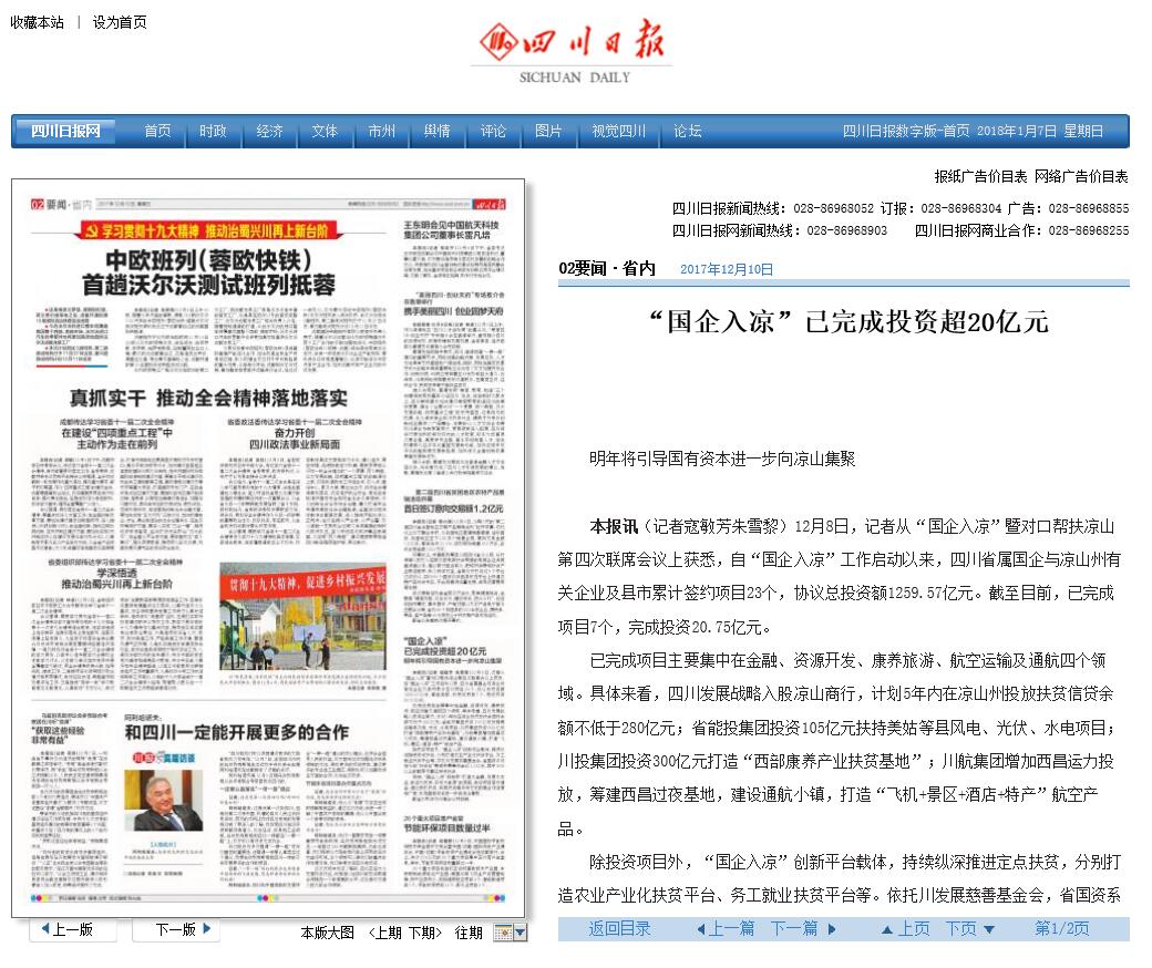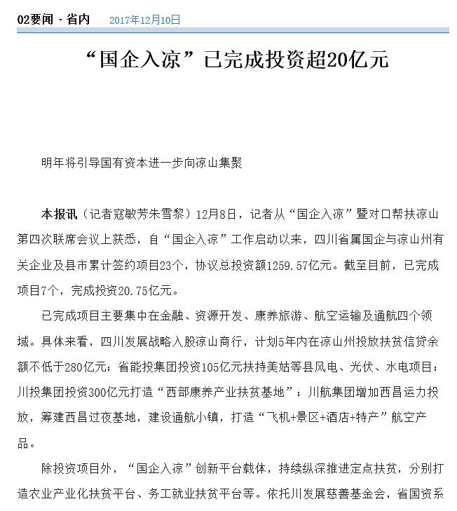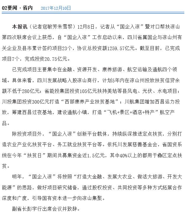 已完成項(xiàng)目主要集中在金融、資源開(kāi)發(fā)、康養(yǎng)旅游、航空運(yùn)輸及通航四個(gè)領(lǐng)域。具體來(lái)看,四川發(fā)展戰(zhàn)略入股涼山商行,計(jì)劃5年內(nèi)在涼山州投放扶貧信貸余額不低于280億元;省能投集團(tuán)投資105億元扶持美姑等縣風(fēng)電、光伏、水電項(xiàng)目;川投集團(tuán)投資300億元打造“西部康養(yǎng)產(chǎn)業(yè)扶貧基地”;川航集團(tuán)增加西昌運(yùn)力投放,籌建西昌過(guò)夜基地,建設(shè)通航小鎮(zhèn),打造“飛機(jī)+景區(qū)+酒店+特產(chǎn)”航空產(chǎn)品。