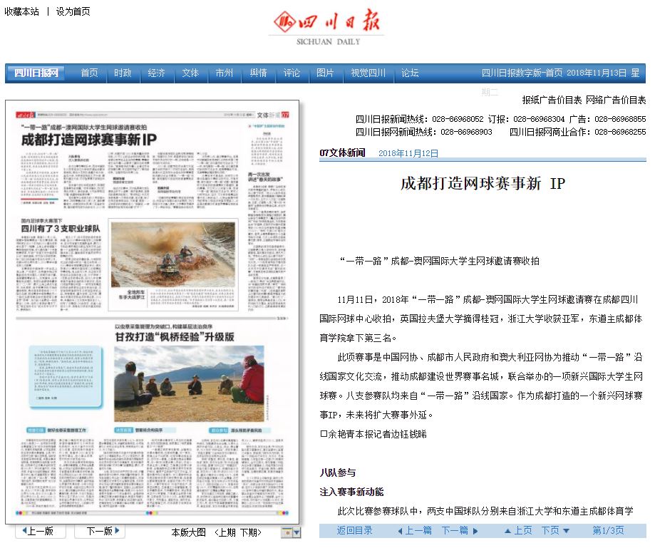 2017年,成都市政府與澳大利亞墨爾本政府進(jìn)行了訪問交流活動,其間就澳大利亞網(wǎng)球協(xié)會相關(guān)網(wǎng)球賽事落地成都達(dá)成合作意向,“一帶一路”成都-澳網(wǎng)國際大學(xué)生網(wǎng)球邀請賽就此誕生。