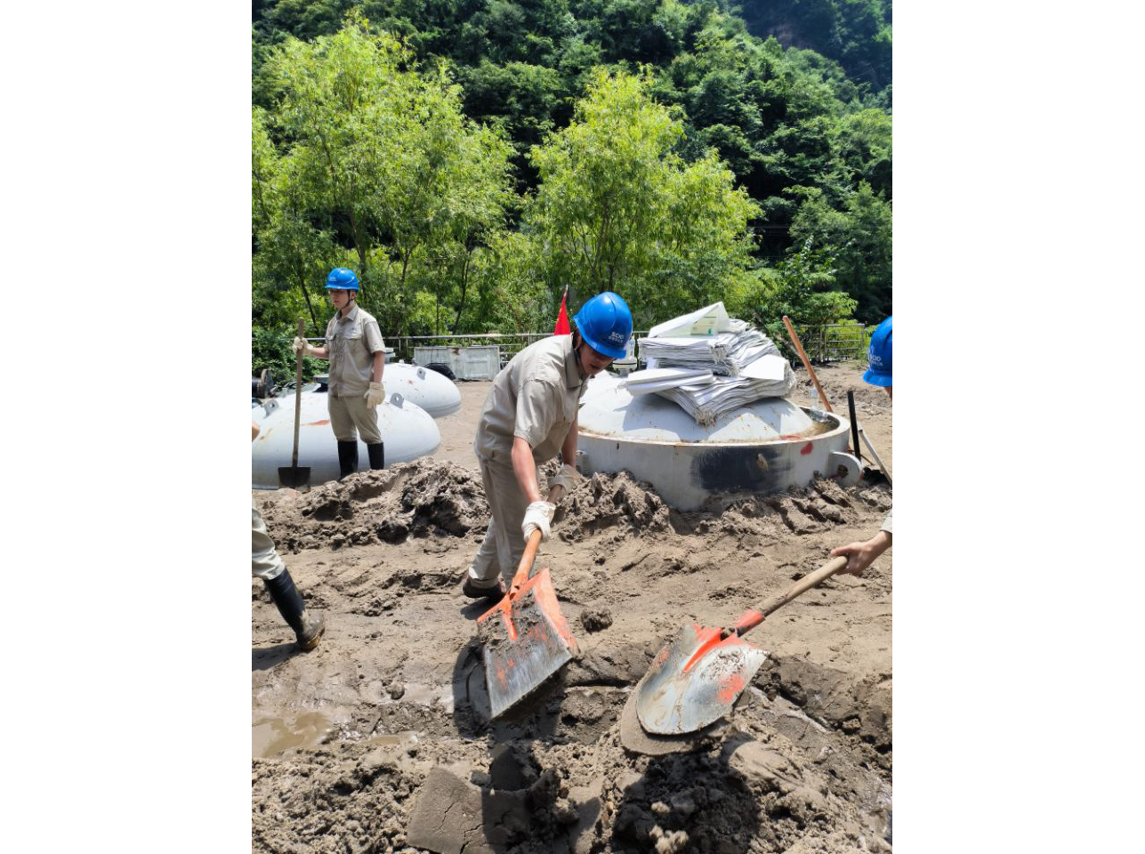 “戰(zhàn)疫保電”的同時(shí),田灣河公司還經(jīng)歷了一次抗險(xiǎn)救災(zāi)考驗(yàn)。8月底,一場大雨裹挾著2萬余方泥石流沖毀了田灣河生產(chǎn)現(xiàn)場通往仁宗海電站的道路與主要線路。為確保安全發(fā)電,基地所有部門悉數(shù)出動(dòng),“白 黑”連續(xù)奮戰(zhàn)搶險(xiǎn)自救。泥濘的滑坡體里,黨員沖鋒在前排查隱患;傾倒的電線桿旁,青年志愿者逐一排查受損情況;被泥水淹沒的庫房里,黨員突擊隊(duì)全力清淤;廠房里、大壩旁,身處交通孤島的黨員職工們沉著冷靜堅(jiān)持工作。