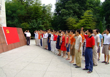2007年7月1日上午,嘉陽集團(tuán)公司黨委在犍為縣烈士陵園舉辦了新黨員入黨宣誓儀式。48名新黨員莊嚴(yán)舉起右手,鄭重向黨宣誓:“我自愿加入中國共產(chǎn)黨,擁護(hù)黨的綱領(lǐng),遵守黨的章程,履行黨員義務(wù),執(zhí)行黨的決定……”知心話兒向黨訴說,錚錚誓言在紀(jì)念碑上空久久回蕩。參加宣誓儀式的新黨員深切緬懷先烈們的豐功偉績和不屈不撓的革命精神,表示要在今后的工作中倍加努力,以黨員的標(biāo)準(zhǔn)嚴(yán)格要求自己,為黨旗增輝添彩,為企業(yè)發(fā)展多做貢獻(xiàn)。黨員們還紛紛在鮮艷的黨旗下照相紀(jì)念,留下人生路途上最光輝的瞬間。