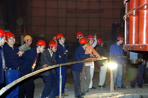 9:20時(shí),在一聲清脆的哨響之后,170噸重的定子緩緩離開支墩,向著機(jī)坑慢慢移動(dòng)。整個(gè)吊裝過程指揮有序、移動(dòng)平穩(wěn)。經(jīng)過25分鐘的緊張作業(yè),2#發(fā)電機(jī)定子于9:45時(shí)順利地成功吊入機(jī)坑。
