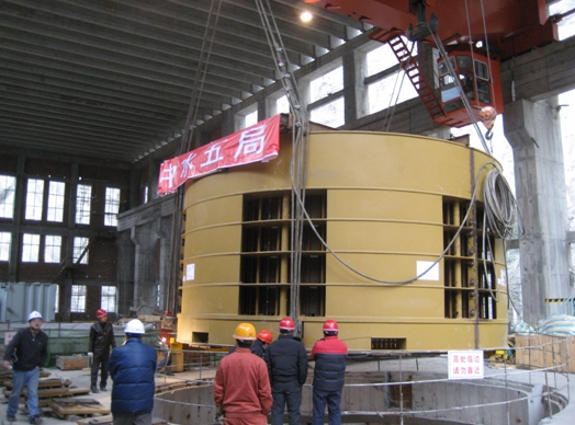 2008年1月20日11:58時,金窩水電站2#水輪發(fā)電機(jī)定子一次性成功吊入機(jī)坑。