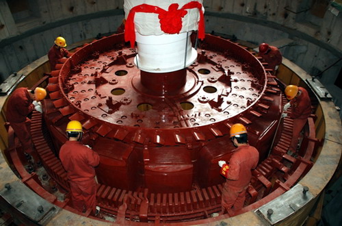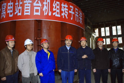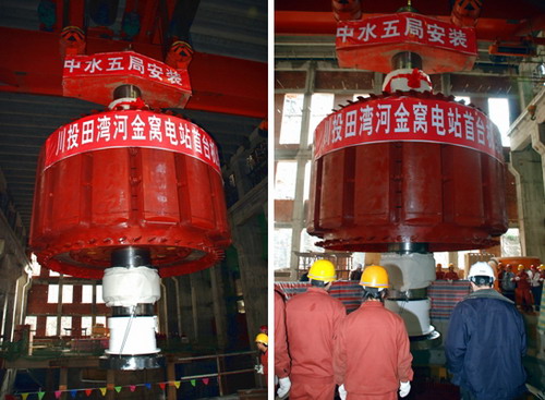 經(jīng)過28分鐘的緊張工作,金窩電站2#機組轉(zhuǎn)子于9∶28時順利吊入機坑。