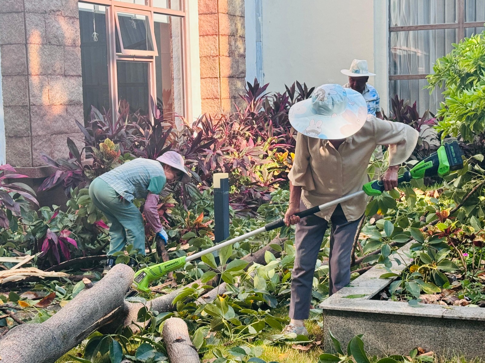 面對狂風暴雨后的雜亂環(huán)境,為確保酒店正常經(jīng)營和賓客的舒適體驗,公司黨支部副書記、酒店負責人范英迅速組織酒店營銷部門及辦公室全體人員投入到一線經(jīng)營區(qū)域雨后恢復工作中,清理倒樹、疏通道路、消除隱患,及時將雜亂無章的經(jīng)營區(qū)域在當日正式營業(yè)前恢復如初。
