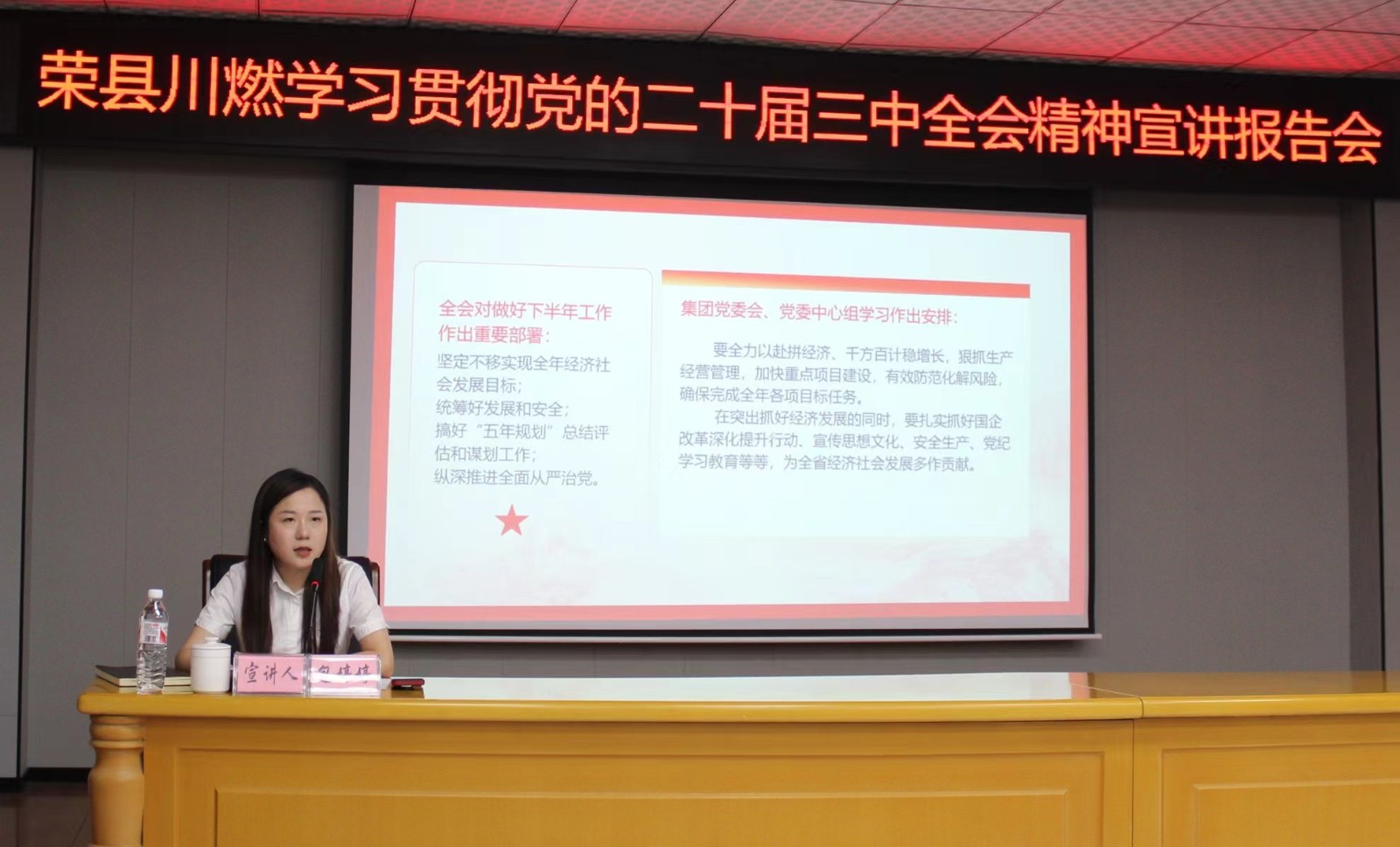 為進(jìn)一步深入學(xué)習(xí)貫徹黨的二十屆三中全會(huì)精神,推動(dòng)全會(huì)精神在榮縣川燃落地生根。9月19日上午,川投燃電黨委副書記、職工董事、工會(huì)主席包婷婷赴榮縣川燃宣講黨的二十屆三中全會(huì)精神。