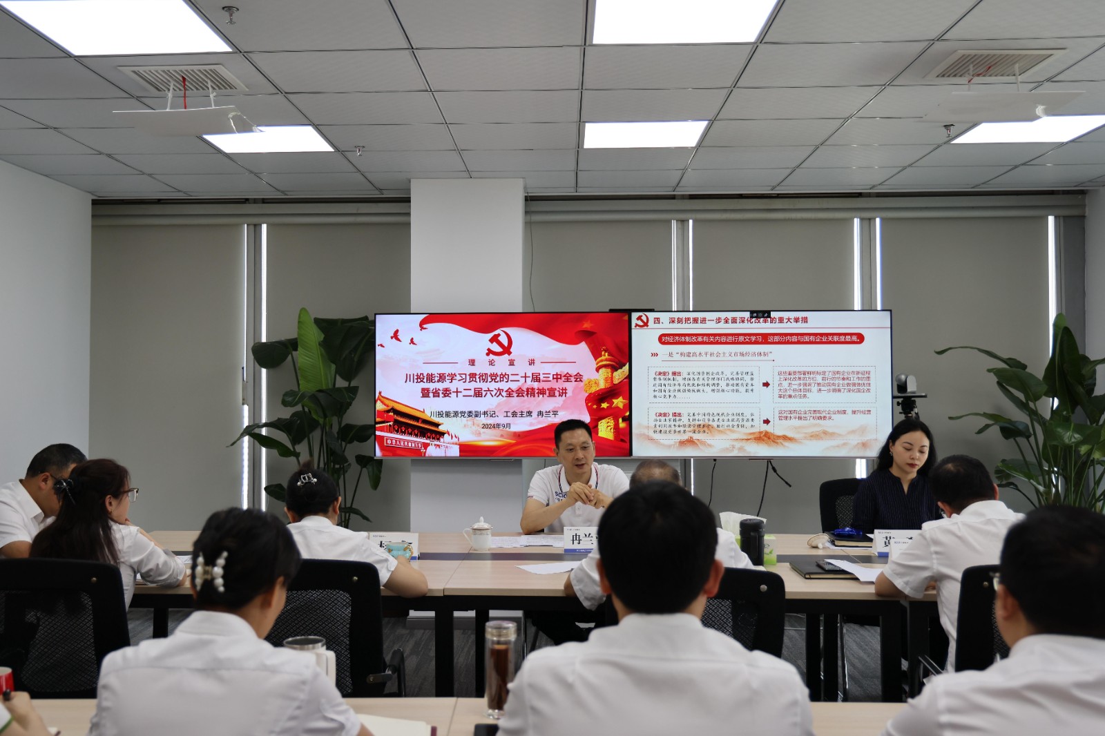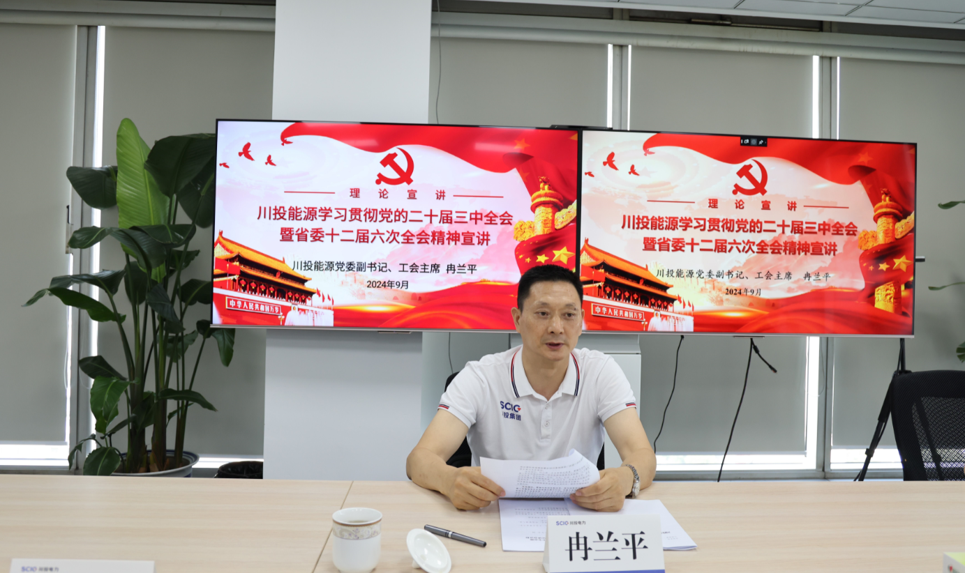 9月26日,川投能源黨委副書記、工會(huì)主席冉蘭平赴川投電力公司專題宣講黨的二十屆三中全會(huì)精神和省委十二屆六次全會(huì)精神,為進(jìn)一步全面深化改革凝心聚力。川投電力黨委副書記、總經(jīng)理蔡承德主持會(huì)議。