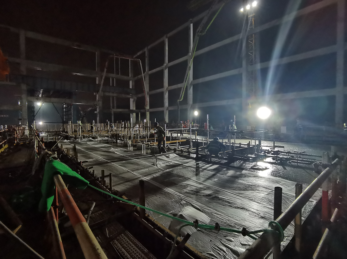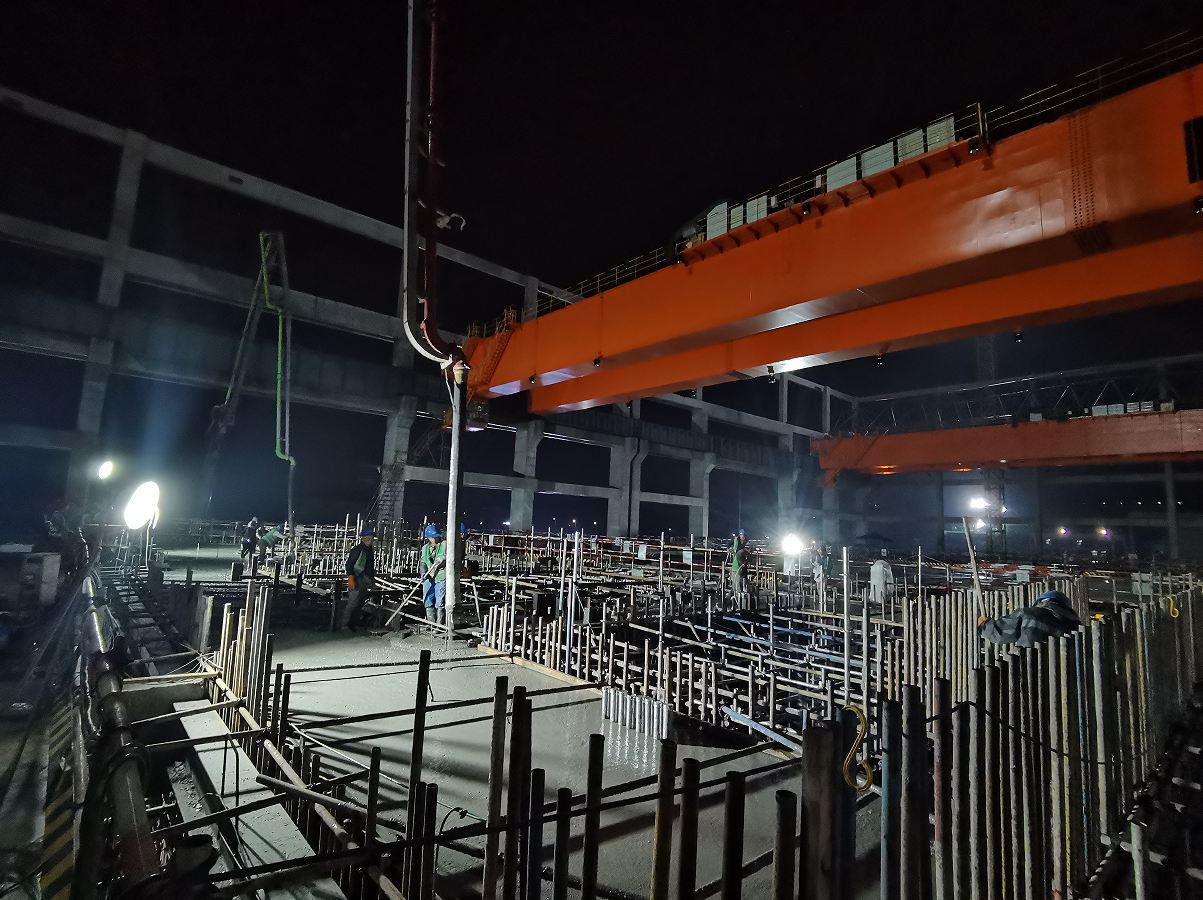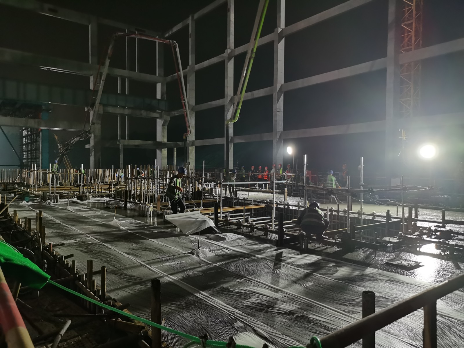 自2023年11月30日達(dá)州氣電二期工程開(kāi)工以來(lái),項(xiàng)目共進(jìn)行了12次大體積混凝土澆筑,涉及余熱鍋爐本體及煙囪筏板基礎(chǔ)、燃汽機(jī)島底板、燃機(jī)10.27米層、汽機(jī)14.95米層基礎(chǔ)等,累計(jì)澆筑混凝土量約14500m3,耗時(shí)約150小時(shí)。其中,本次燃汽機(jī)島底板的澆筑量最大,高達(dá)2900m3,需要連續(xù)澆筑28小時(shí),混凝土運(yùn)輸190余車次。