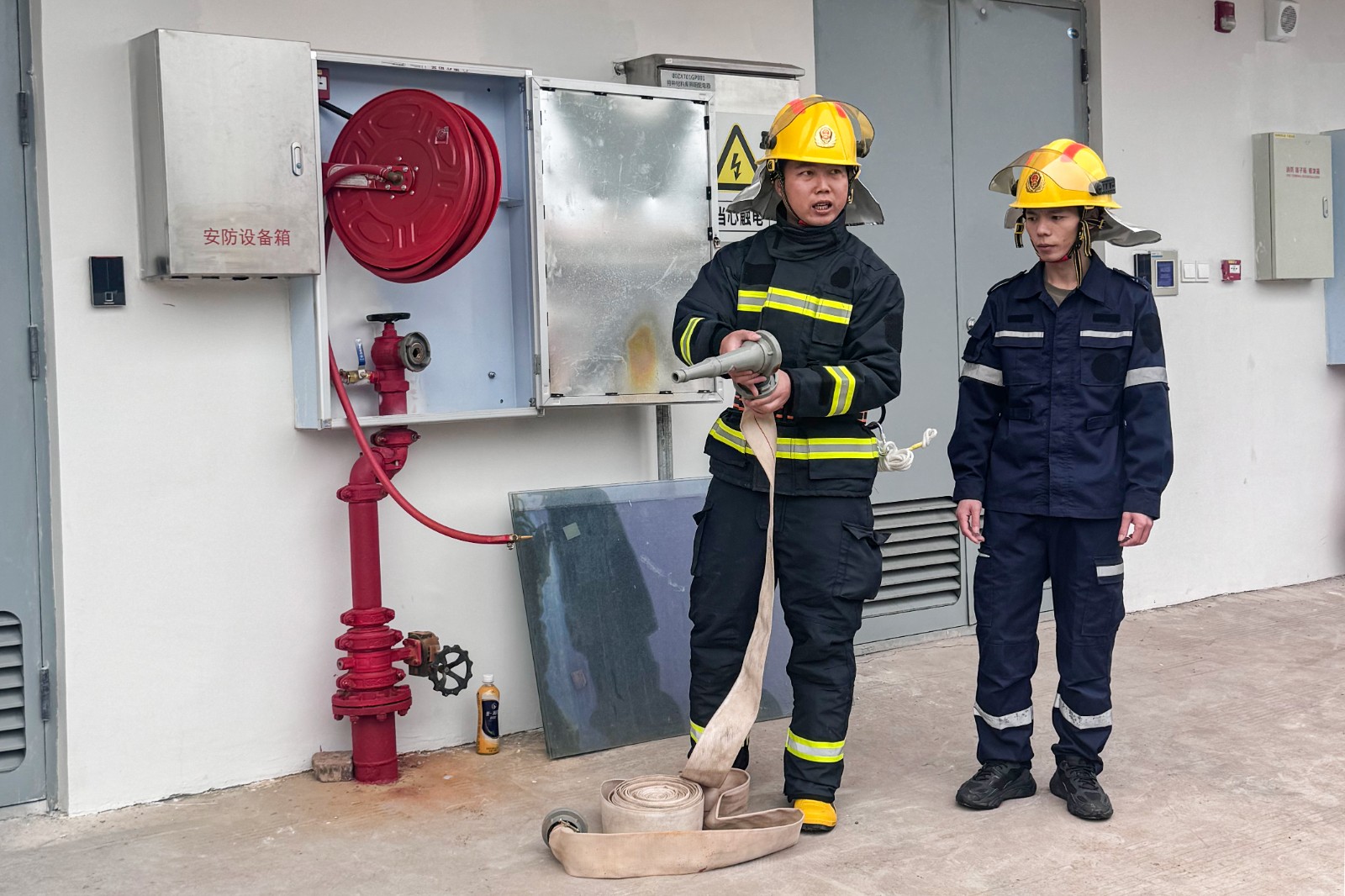 本次演練以特種材料庫房油漆臨時(shí)存儲間突發(fā)火災(zāi),燃燒物已威脅到旁邊的油漆桶且火勢有擴(kuò)大趨勢為模擬場景。10時(shí),演練正式開始,消防站消防報(bào)警主機(jī)接到火災(zāi)報(bào)警信息后立即上報(bào)值長臺,值長臺在核實(shí)火情信息后立即通知各應(yīng)急小組(運(yùn)行人員、消防巡檢人員、設(shè)備管理部及外委單位人員)趕赴火災(zāi)現(xiàn)場參與火災(zāi)撲救,同時(shí)上報(bào)演練總指揮并啟動應(yīng)急預(yù)案。火災(zāi)撲滅后,公司消保隊(duì)組織進(jìn)行滅火器現(xiàn)場講解和示范,并指導(dǎo)參演人員現(xiàn)場操作消火栓進(jìn)行火災(zāi)撲救。