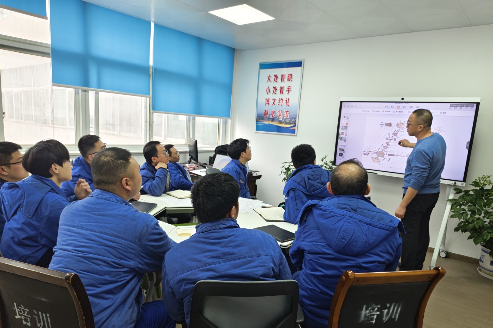 培訓(xùn)中,主講人憑借深厚的專業(yè)知識與豐富的實(shí)踐經(jīng)驗,深入剖析了汽輪機(jī)調(diào)速系統(tǒng)的工作原理、保護(hù)、試驗、設(shè)備結(jié)構(gòu)特點(diǎn)等,并結(jié)合實(shí)際案例,詳細(xì)講解了日常維保要求、常見故障的診斷及如何快速定位故障點(diǎn)的方法。借助多媒體設(shè)備,主講人將復(fù)雜的油路原理圖變得一目了然,使得培訓(xùn)內(nèi)容更易理解及接受。培訓(xùn)期間,參加人員積極互動,達(dá)到預(yù)期的培訓(xùn)效果。