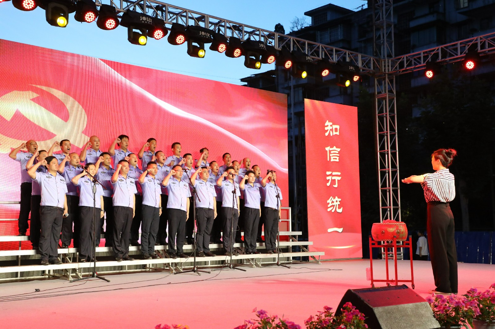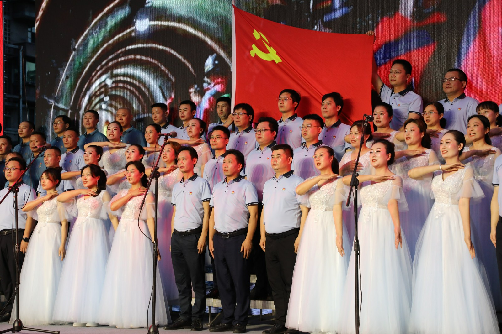 2個(gè)多小時(shí)的演出中,嘉陽煤礦、福溪粉煤灰公司、機(jī)電制造維修分公司、川投峨旅、物資供銷公司等不同單位,分別合唱表演了《領(lǐng)航》《我宣誓》《星火燎原》等歌曲,公司黨委結(jié)對聯(lián)建單位川投大健康帶來了歌曲《燈火里的中國》,駐礦單位犍為縣芭石煤炭獨(dú)立工礦區(qū)醫(yī)院合唱了《我和我的祖國》,歌聲時(shí)而雄壯豪邁,時(shí)而柔情滿懷,表達(dá)了當(dāng)代礦工跟黨走、頌黨恩的美好心愿。