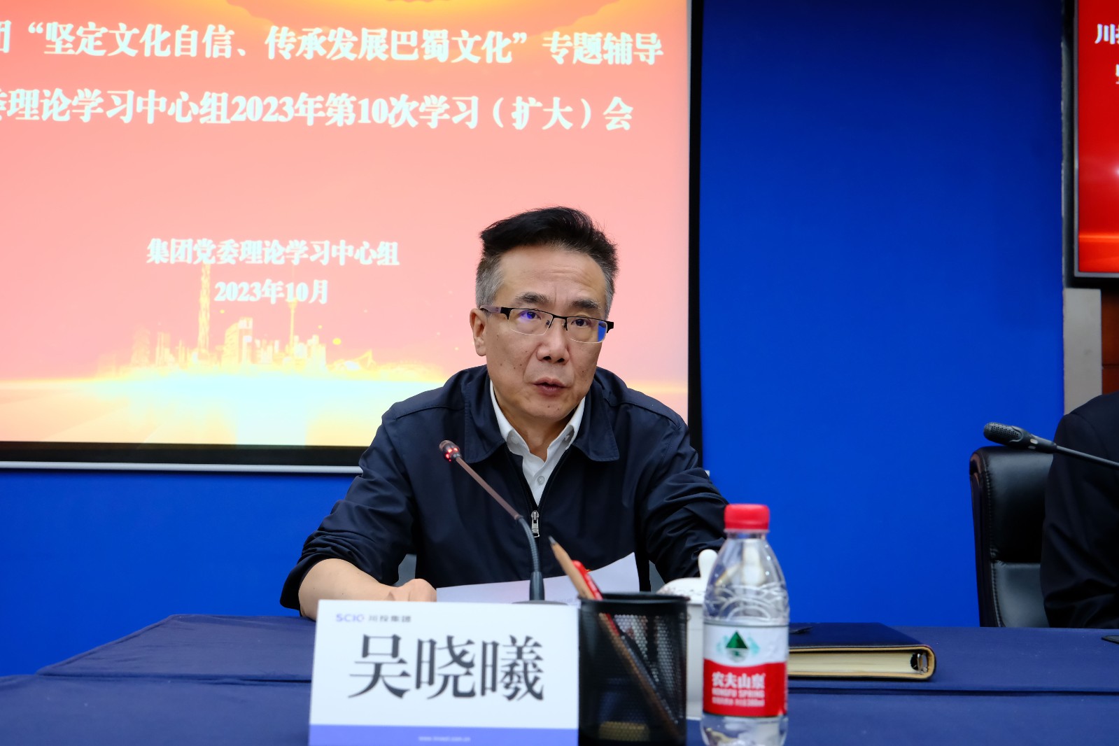 10月12日上午,川投集團(tuán)召開(kāi)黨委理論學(xué)習(xí)中心組學(xué)習(xí)(擴(kuò)大)會(huì),深入學(xué)習(xí)習(xí)近平總書(shū)記關(guān)于宣傳思想文化和意識(shí)形態(tài)工作的重要指示、習(xí)近平總書(shū)記關(guān)于全面從嚴(yán)治黨的重要論述、習(xí)近平總書(shū)記關(guān)于主題教育的最新重要講話,重溫學(xué)習(xí)習(xí)近平總書(shū)記在文化傳承發(fā)展座談會(huì)上的重要講話,傳達(dá)學(xué)習(xí)全國(guó)宣傳思想文化工作會(huì)議、中央和省委巡視工作規(guī)劃專(zhuān)題培訓(xùn)會(huì)精神,集中學(xué)習(xí)黨的民族宗教政策等,圍繞“堅(jiān)定文化自信、傳承發(fā)展巴蜀文化”開(kāi)展專(zhuān)題輔導(dǎo),集團(tuán)黨委書(shū)記吳曉曦主持會(huì)議并講話。